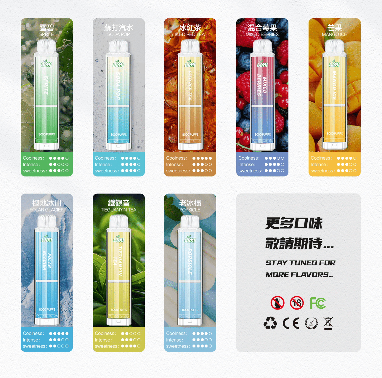 薄荷 ,哈密瓜 ,芒果 ,西瓜 ,芭樂 ,葡萄 ,雪碧 ,山竹荔枝 ,蘇打汽水 ,蜜桃 ,百香果 ,冰红茶 ,混合莓果 ,極地冰川 ,鐵觀 ,老冰棍 |