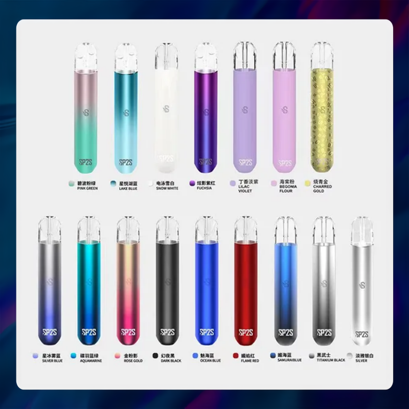 SP2S 一代電子煙主機以 400mAh 電池、Type-C 快充、9W 功率、陶瓷霧化芯、發光設計及通用一代煙彈打造,16 色可選。